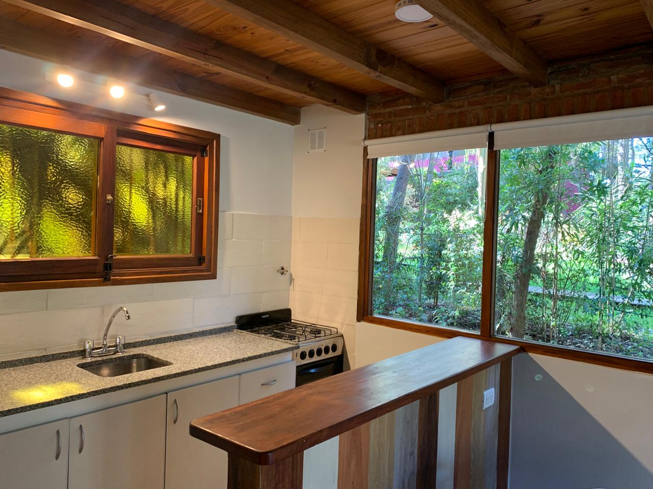 Unidad en dos plantas (40 m2). En planta baja, amplio living-comedor con cocina integrada, salamandra Tromen, sommier diván con cama carrito, placard y baño completo con bañera.